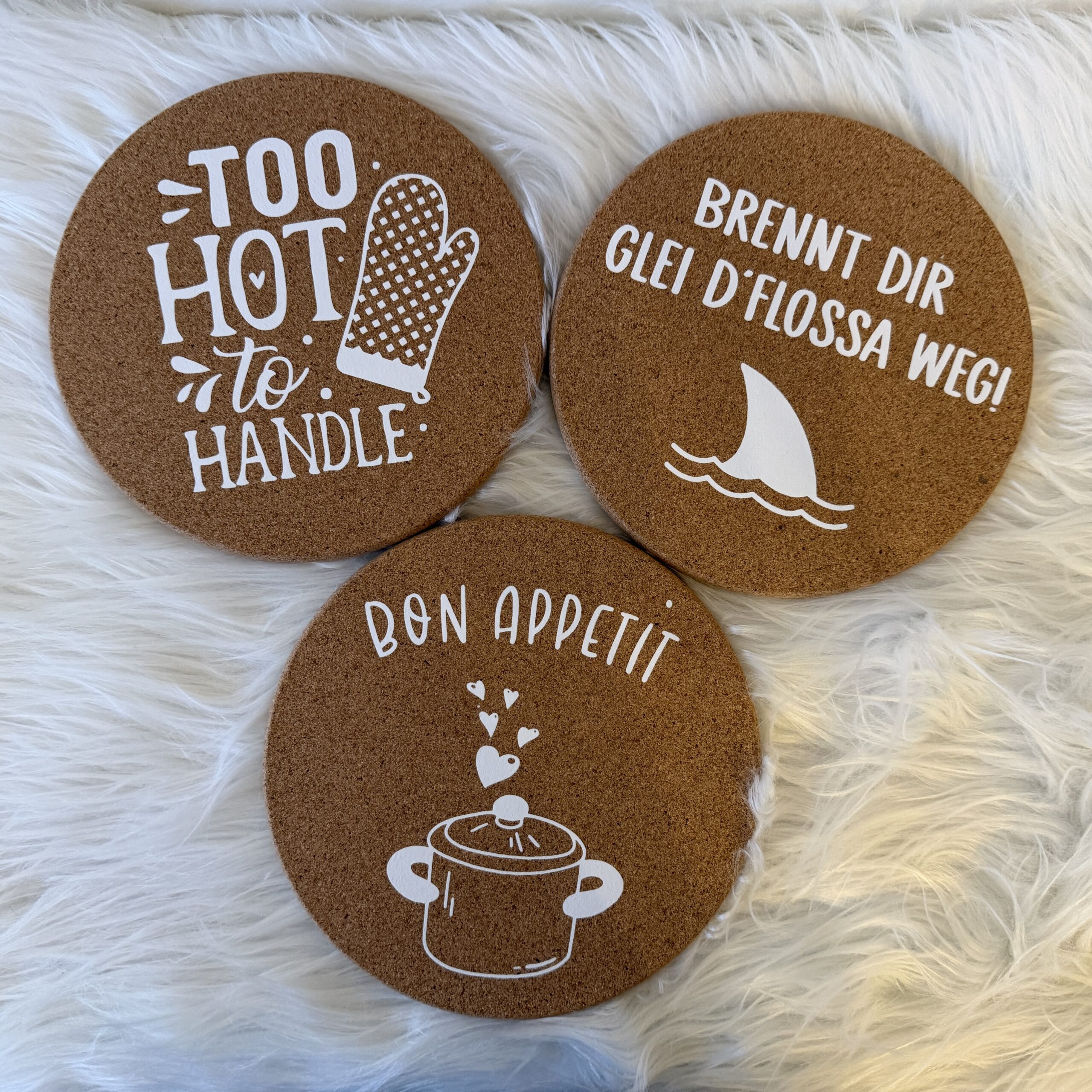 Natürlich, praktisch und mit Humor – unsere personalisierten Korkuntersetzer bringen Wärme und Persönlichkeit auf jeden Esstisch.